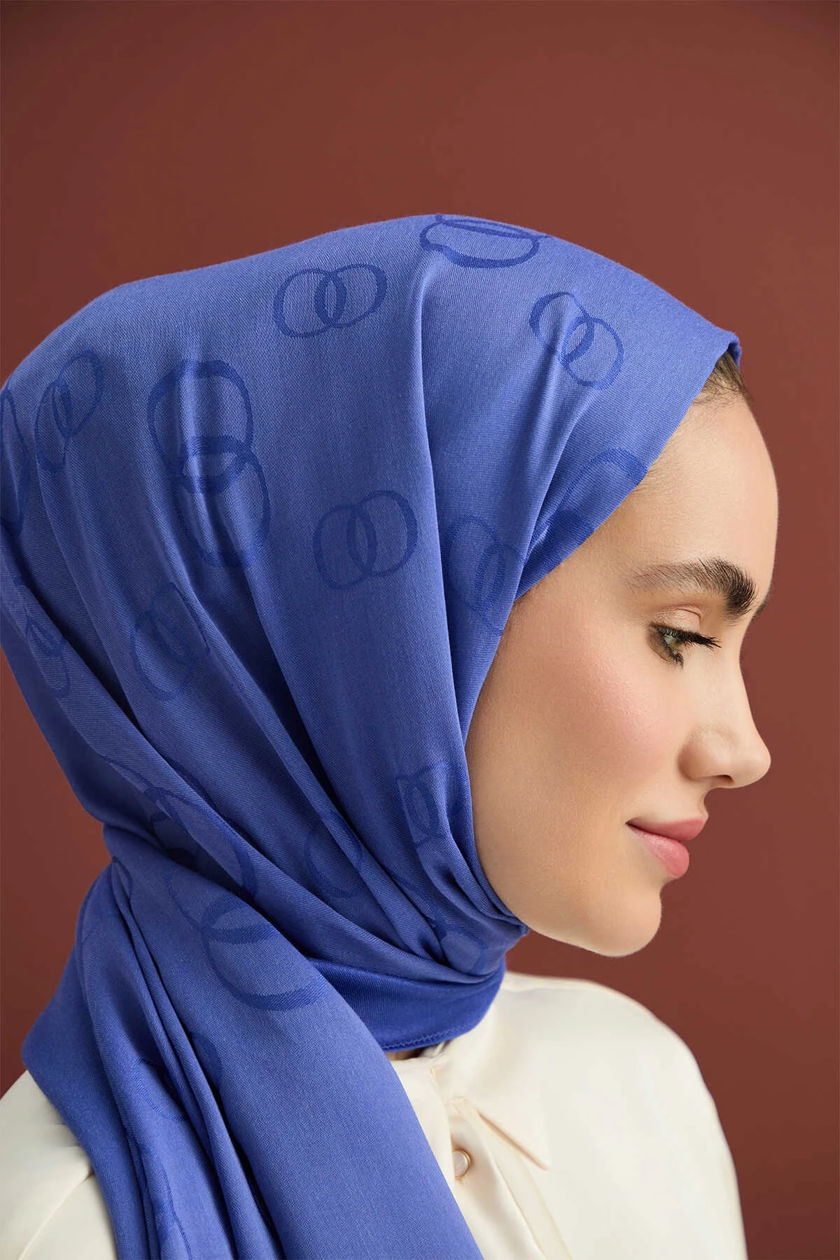 De kobaltblauw kleur voegt een elegante en tijdloze uitstraling toe, terwijl het unieke patroon — bestaande uit het iconische bedrijfslogo, twee in elkaar verweven ‘O’-letters in verschillende groottes en zowel horizontaal als verticaal geplaatst — een moderne en stijlvolle look creëert.